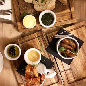 Instead of going down the traditional starter route we opted for a few nibbles between us. We chose the homemade bread, the pork crackling with apple sauce and the teriyaki cocktail sausages.